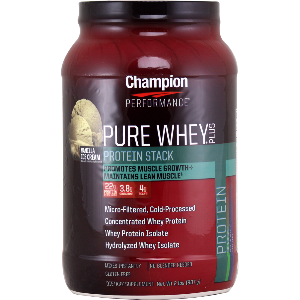 Pure Whey® Plus 100% Whey Protein Stack® delivers micro-filtered, cold processed concentrated whey protein, hydrolyzed whey & whey isolate, packed with Essential Amino Acids for building and maintaining lean muscle mass.